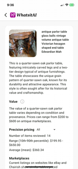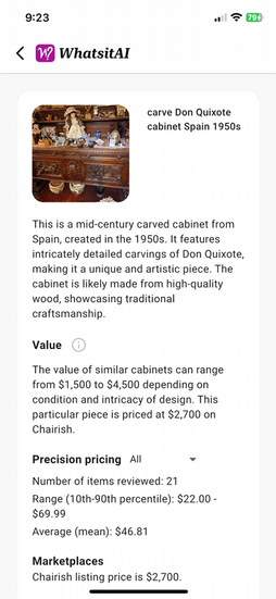 This valuation, provided by WhatsItAI, are of the 100+ "big furniture" items that are found in the inventory section. These include all the dressers, wardrobes, tables, nightstands, display cases, beds, chairs and other large format items.